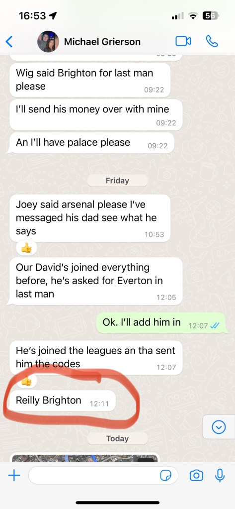 One more entry to be added that I missed from a WhatsApp chat last Friday. My son told me his pick for round 2 yesterday, along with his friend’s pick. It then came to light that I had missed this entry in a series of WhatsApp exchanges – seeing as it was my fault I am adding him into the game.