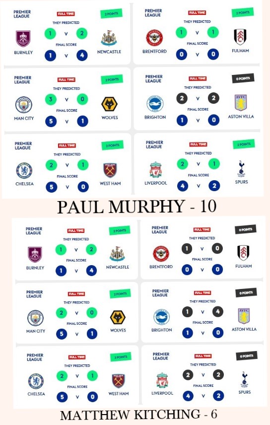 That meant the final, on weekend of 4th May was to be contested between Paul Murphy and Matthew Kitching. Matthew forecast that Newcastle, Manchester City and Chelsea would win – scoring 6 points. Paul, however, also predicted them 3 results as well as a draw in the Brentford/Fulham game and a win for Liverpool, scoring 10 points and winning the final.